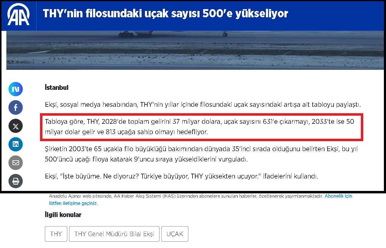 İktidar basını Türkiye’nin 225 Boeing siparişini, THY’nin filosunu büyütmek için atılan gerekli bir adım gibi sunmaya çalışıyor. Ancak tek seferde 225 Boeing siparişi THY’nin hedefleri içinde değil ve planlanan ihtiyacın çok üstünde. THY’nin bir numarası olan Genel Müdür Bilal Ekşi, bizzat 7 Mart 2025’te yani yaklaşık 6 ay önce yaptığı açıklamada, THY filosunu 500’e çıkardıklarını ilan ederek, hedeflerinin 2028’de uçak sayısını 631’e çıkarmayı hedeflerini duyurdu. 2033’te ise 813 uçağa sahip olmayı hedeflediklerini ilan etti.
