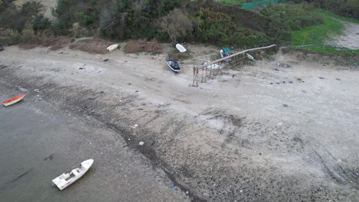 Görüntülerde, karaya oturan tekneler, toprak üzerinde kalan iskele ve suyun kıyıdan metrelerce uzaklaştığı net şekilde görüldü.
